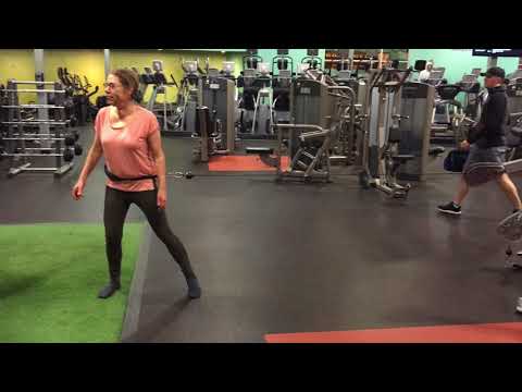 I use the Banana Sling by QTEK attached to a cable machine for this exercise. It substitutes for side stepping with a band around my legs. The exercise is meant to strengthen the pushing off motion and associated hip muscles. I'm supposed to keep my core stable as one piece that moves together for this exercise. I don't quite have that down, you can see some wobble through my core as I step to the side.